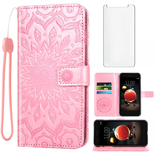 Protect your LG Aristo 2 3 Plus/Rebel 4 LTE/Tribute Empire Dynasty/Zone 4/K8 Plus 2018 K8S/Fortune 2/Phonenix 4/Risio 3 with this stylish Rose Gold wallet phone case. It features a durable kickstand for comfortable viewing, three card slots and a wallet for keeping your essentials organized, and it comes with a tempered glass screen protector. The case is compatible with various LG models and provides full access to all ports and buttons. With a detachable wrist strap and a beautiful design, this phone case offers both functionality and style.