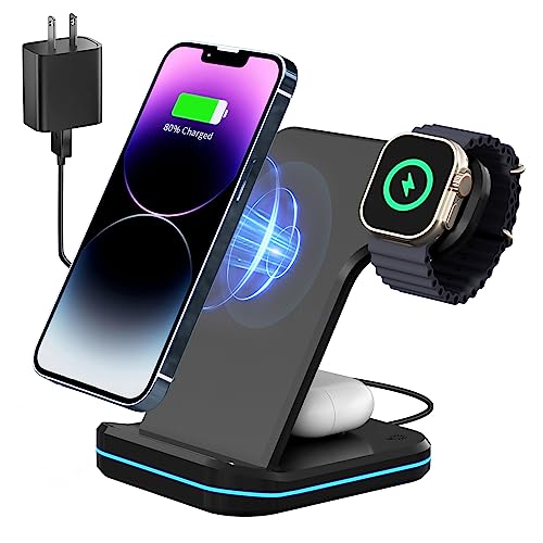 The Wireless Charger, 3 in 1 Wireless Charging Station is the perfect device for Apple fans. It can charge most phones and offers fast wireless charging for multiple devices at the same time. This charging station is compatible with iPhone models from 8 to 14, Apple Watch models from 2 to 7, and AirPods with wireless case. With its foldable and portable design, it is ideal for home, office, and travel use. The charging pad also serves as a cell phone stand, making it versatile and practical. With safety features like over-current and over-voltage protection, as well as a smart breathing nightlight, this wireless charger offers convenience and peace of mind. The charger comes with an 18W adapter and is a perfect gift for your loved ones.