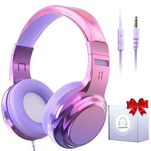 The QearFun Headphones for Girls Kids for School are a perfect gift for back to school. These cool wired headphones feature a trendy gradient light purple design, appealing to kids and teens. With a 3.5mm jack and volume limited to 85dB, they are compatible with various devices and ensure safe listening for children. The adjustable faux leather headband and soft ear pads provide a comfortable fit for kids aged 3-16. The headphones also offer excellent sound quality with crisp, clear sound and enhanced bass, allowing kids to enjoy music, audiobooks, and learning resources. The built-in microphone is perfect for online learning, gaming, and video chatting. With excellent customer service and a 30-day money-back warranty, these headphones provide a great experience for kids.